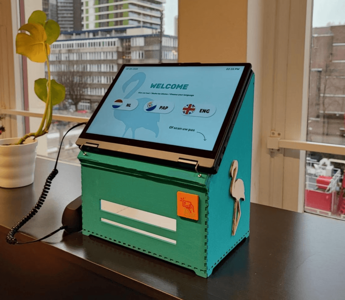Onze oplossing is BonaPoint, een fysieke service kiosk die documenten uit kan printen en scannen voor de gebruiker. De kiosk is te gebruiken door middel van een fysieke pas waar de persoonlijke gegevens van de gebruiker op staan. Door deze pas onthoudt de kiosk je officiële documenten en afspraken gemakkelijk voor de volgende keer. Voor extra privacy en veiligheid moet je naast het pasje ook een pincode invoeren.